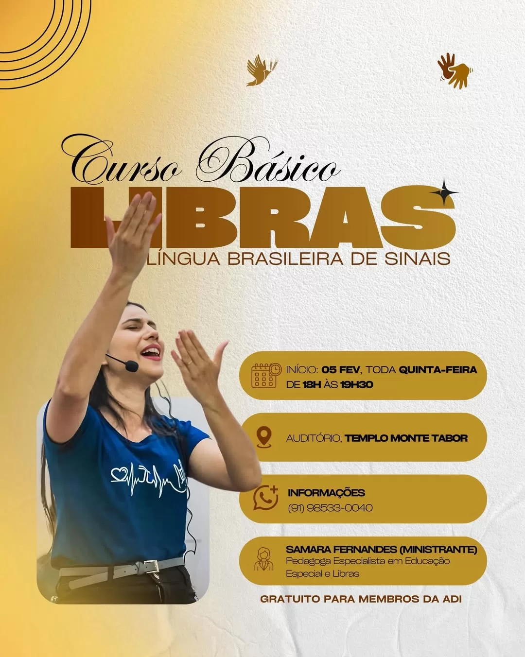 O Curso Básico de Libras (Língua Brasileira de Sinais) começa no dia 05 de fevereiro. As aulas acontecem todas as quintas-feiras, das 18h às 19h30, no Templo Monte Tabor. A