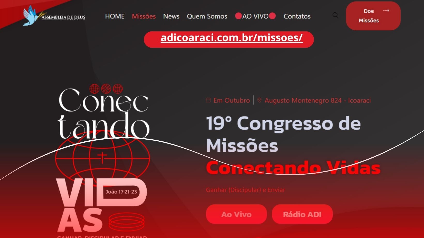 Vem aí o nosso tão esperado Congresso de Missões. Esse ano o tema será “Conectando Vidas” Prepare o seu coração com grandes expectativas no Senhor, pois Ele fará maravilhas em